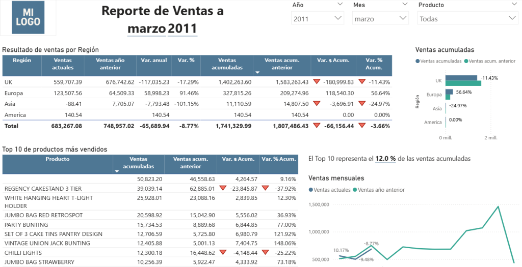 Reporte para el análisis mensual de ventas comparándolas con las ventas del año anterior por región y Top de productos. Se puede hacer un seguimiento de las ventas acumuladas con este reporte.