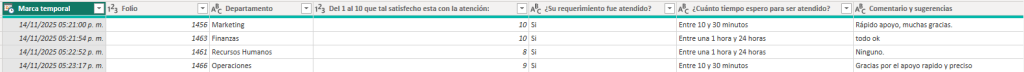 Campos: Marca temporal, Folio, Departamento, Del 1 al 10 que tal satisfecho esta con la atención:, ¿Su requerimiento fue atendido?, ¿Cuánto tiempo espero para ser atendido?, Comentario y sugerencias