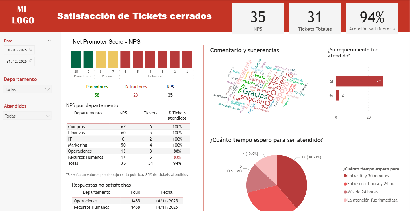 El dashboard tiene como objetivo conocer la calidad del servicio prestado por el área de mesa de ayuda. Los usuarios internos contestan la encuesta a través de Google Forms sobre el ticket cerrado de soporte y con eso se mide el % de cumplimiento, la satisfacción y el tiempo de atención. Esto también facilita la actualización de los datos.